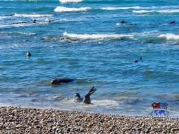 Wir müssen also Geduld haben und warten, warten, warten... ganze 7 Tage warten und beobachten wir das Meer, bis wir am Palmsonntagmorgen endlich einen Orca sichten, der ganz nahe an die Robben heran schwimmt. Wow, was für ein Erlebnis. Wir sind ganz aufgeregt. Mehrmals versucht das riesige Tier eine Robbe zu erbeuten, aber er hat kein Glück. Anscheinend ist der Einsame ein junges Männchen das Hunger hat. Üblicherweise jagen Orcas im Verbund von mehreren, um der Beute erst den Weg abzuschneiden und dann zu fangen. Am Dienstag haben wir erneut Glück und können eine Gruppe von vier Killerwalen beobachten. Da zur Wochenmitte ein Wetterumschwung erwartet wird mit Kälte, Wind und Regen, entschließen wir uns nach einem letzten whale watching am Mittwochmittag abzureisen. Der Mittwoch wird dann noch unser Glückstag. Kaum treten wir am Morgen aus dem Indi, schwimmen bereits die ersten zwei Schwertwale (quasi vor unserer Haustüre) vorbei. Eine Stunde später sehen wir von unserem Aussichtspunkt eine Gruppe von sogar 5 Orcas! Der Wahnsinn!!! Wir können‘s gar nicht fassen. Bei abnehmender Flut gehen wir zurück zum Indi und machen Frühstück. Uns ist beiden aufgefallen, dass die große Robbenkolonie gar nicht mehr so groß ist und nicht mal mehr aus 40 Tieren besteht. Ob die verschwundenen Robben wohl von Orcas gefressen wurden? Während wir unsere Vermutungen diskutieren und aus dem Fenster blicken, trauen wir unseren Augen nicht: Zwei weitere Killerwale tummeln sich vor uns im Meer. Was für ein Tag. Nie hätten wir damit gerechnet so häufig und so viele Orcas zu sehen. Als wir am Mittag Punta Ninfas in Richtung Puerto Madryn verlassen, sind wir überglücklich.