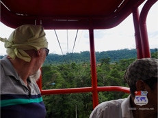 Leider hat sich Jan am Fin del mundo erneut das Knie verdreht, deshalb bleiben wir noch weitere drei Tage hier stehen. Während Jan sich auskuriert werde ich erneut mit Banda die Wanderung zum Fin del mundo unter die Füsse nehmen. Eh man den Wanderweg erreicht, geht es per schaukelnder Gondel über das tiefe Flussbett des Río Tatacoa. Wie schon beim ersten Mal freut sich Banda auf die Wanderung und hüpft freiwillig in den kleinen Gitterkäfig. Bereits wieder auf dem Rückweg möchte ich den Hund kurz vor der Seilbahn an die Leine nehmen. Schliesslich warten schon einige Leute auf den Transfer und Banda nutzt jede Gelegenheit fremde Menschen um Futter anzubetteln. Ich rufe ihr, aber sie kommt nicht. Komisch, sie weiss doch dass sie was bekommt wenn sie folgt. Ich rufe ein weiteres Mal, aber es hilft Nichts. Die Hündin bleibt verschwunden. Immer wieder „Banda, Banda,… „ rufend komme ich an der Gondel an. Die Wanderer erklären mir Banda sei bereits in der vorigen Gondel eingestiegen und somit bereits auf dem Weg zu Jan im Indi. Meine grösste Sorge in diesem Moment sind die Hühner, die auf der anderen Flußseite frei herumlaufen. Hoffentlich sind die gerade nicht unterwegs und für Banda unauffindbar. Als ich endlich aus der Seilbahn aussteige wartet Jan schon mit dem Hund auf mich. Banda würde am liebsten gleich wieder einsteigen und über das Flusstal schweben. Wir wussten gar nicht, dass unsere Hündin so ein Technik-Fan ist.