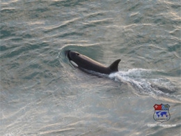 Das ist er, der Killerwal - wie der weisse Hai kommt er uns vor. Es ist wahrscheinlich ein einsames Orca-Männchen.