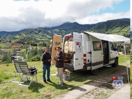 Wer unseren Februar-Bericht gelesen hat weiß, kaum sind wir nach Kolumbien eingereist, lernen wir herzliche Menschen kennen. Dazu gehört die Familie Guzman aus Pasto, genauer aus dem Ortsteil „San Fernando“. Die Geschwister Adriana, Juan Diego und Ivan laden uns zu sich auf ihr wunderschön gelegenes Grundstück ein um dort eventuell politischen Ausschreitungen zu entgehen und bis mindestens nach den Wahlen zu verweilen. Dieses Angebot nehmen wir sehr gerne an und parken unseren Indi auf dem Grundstück mit herrlicher Aussicht. Auch unsere Hündin Banda ist glücklich mit dieser Entscheidung, denn mit den vielen anderen Hunden auf dem Gelände kann sie herrlich rumtoben. Zwischen dem belgischen Schäferhund Bless und Banda scheinen sich sogar zarte Bande einer Hundeliebe zu spannen.