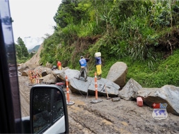 Am Freitag, den 4. März machen wir uns auf den Weg zur Küstenstadt Tumaco. Allerdings kommen wir dort erst am Sonntag an. Schuld ist ein grosser Erdrutsch mit Felssturz, der uns zwei Tage auf der Strasse warten lässt. Erst heisst es, wir können ca. in 3 Stunden weiterfahren. Als dann aber eine Baumaschine nach der anderen an uns vorbei zieht wird uns klar, das kann länger dauern. Wir beobachten wie nach und nach ein reger Taxidienst für „Fußgänger“ entsteht. Mopedfahrer bringen Passanten von der Strassensperre zum Erdrutsch und umgekehrt. Immerhin scheint bereits eine Fussdurchquerung möglich, da kann es doch nicht mehr lange dauern bis Autos durchfahren können? Zwei Tage später bekommen wir die Info, Mittags um 12 Uhr wird die Strassensperre aufgehoben. Nicht nur wir sind ungeduldig und scharren mit den Hufen. Am Schlagbaum herrscht ein reges Gedränge aller Fahrzeuge und wie soll’s anders sein, ein kleines Chaos entsteht. Pünktlich um 12 Uhr dürfen wir losfahren und inmitten zig anderen Fahrzeugen rollen wir im Schneckentempo über die verwüstete Strasse. Mannshohe Felsen liegen am Strassenrand, welche zwei Tage später (bei unserer Rückfahrt) immer noch nicht ganz weggesprengt sind. Verheerend zu sehen, was Regen alles auslösen kann.