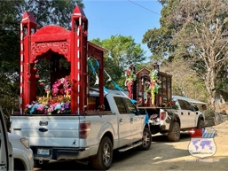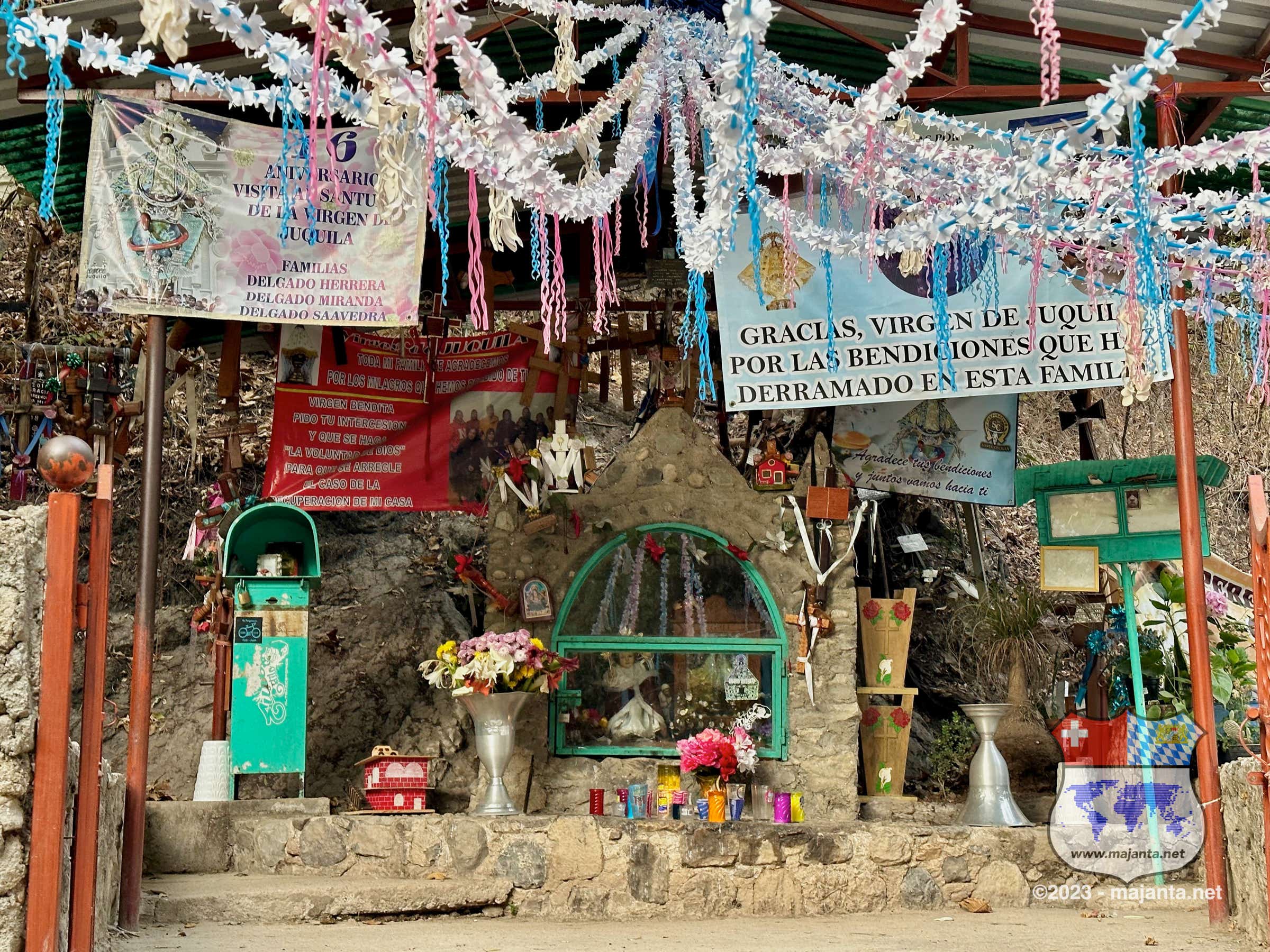 Am nächsten Tag kommt zu Fuss eine grössere Gruppe Wallfahrer an um sich zu stärken. Die Wanderer werden von drei PickUps begleitet, auf deren Ladeflächen die Modelle der Kirche von Juquila errichtet sind. Die Pilger kommen aus dem Staat Puebla und sind schon 10 Tage unterwegs. Sie werden noch 3 weitere Tage bis zur Ankunft in Juquila brauchen. Juquila? Was ist dort? In Santa Catarina Juquila steht die Wallfahrtskirche zu Ehren der heiligen Jungfrau und diese ist ihr Ziel. Wir wünschen den weiterziehenden Wallfahrern alles Gute, geben ihnen wie hier üblich Gottes Segen mit auf ihren Weg und überholen sie letztendlich freundlich hupend auf unserer Weiterfahrt. Danach kommen wir an weiteren Begleitfahrzeugen dieser Pilger-Gruppe vorbei, nämlich an Lastwagen deren Ladeflächen als Übernachtungsplatz für die Gläubigen dienen. Wir staunen über die gute Organisation der Wallfahrer.