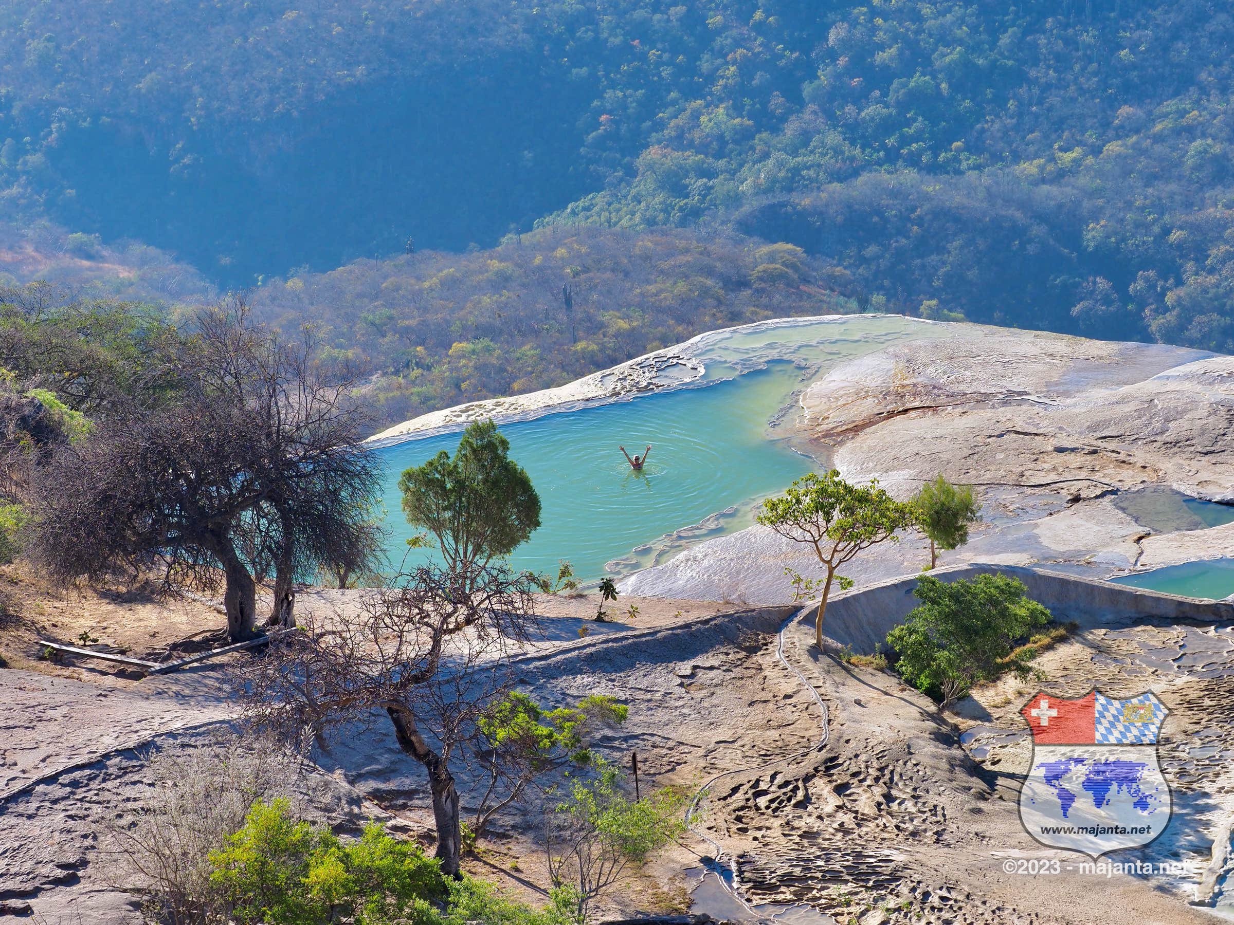 Hierve el Agua - frei übersetzt „Koch das Wasser!" - ist ein beliebtes Ziel im Staat Oaxaca. Die weissen Kalkterrassen und Wasserfälle haben sich über Jahrtausende hinweg aus Thermalwasser mit sehr hohem Mineralgehalt gebildet. Hierve el Agua ist auch von archäologischem Interesse, denn bereits vor 2'500 Jahren hat das Volk der Zapoteken hier ein komplexes Bewässerungssystem errichtet, wie es bis dahin in Mesoamerika kein vergleichbares gab. Man geht davon aus, dass Hierve el Agua für die alten Völker des Oaxaca-Tals ein heiliger Ort war.