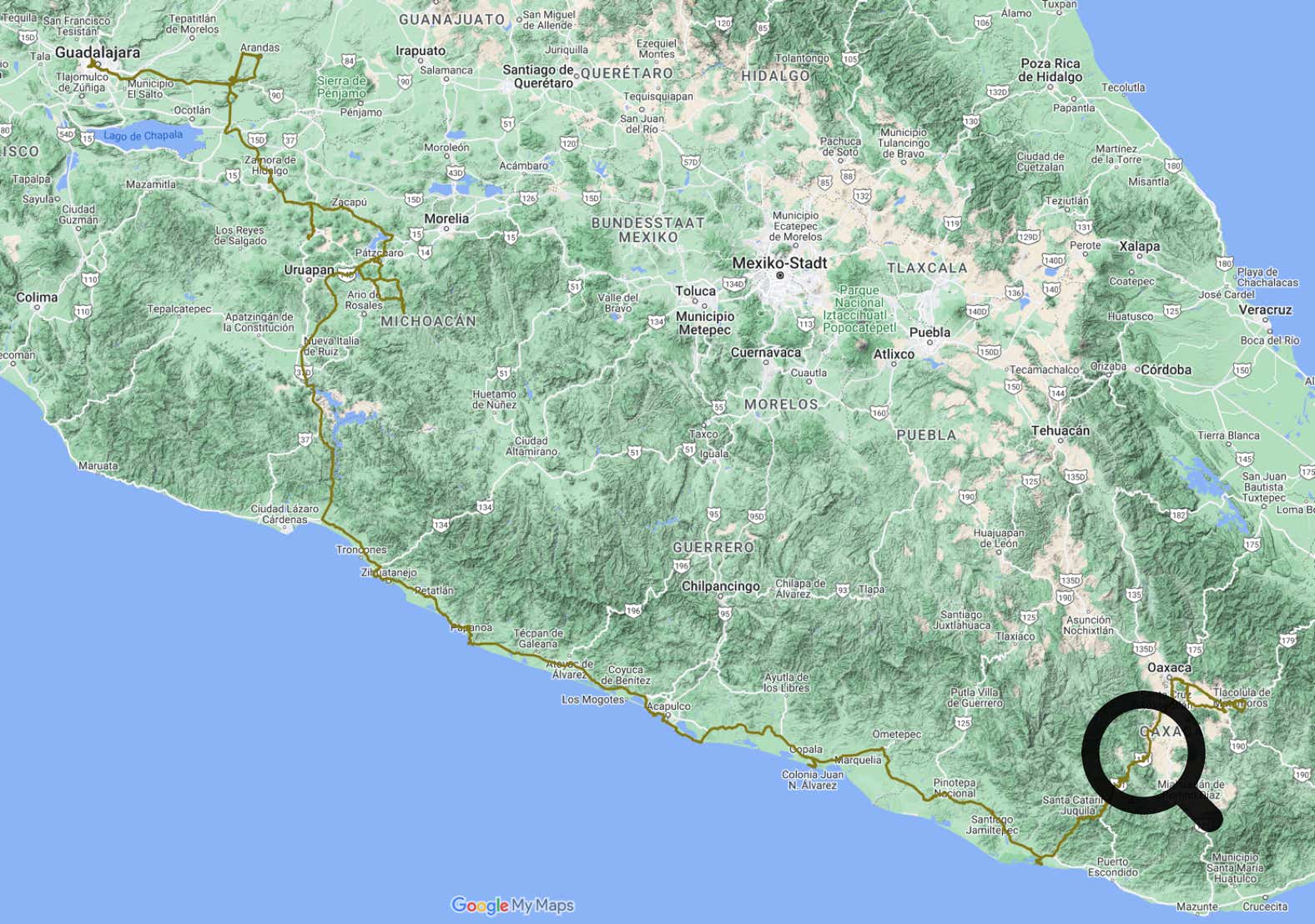 Pünktlich zum 1. März verlassen wir nach 6 Wochen Aufenthalt endlich den „El Rancho RV-Park“ in östliche Richtung. Wir wollen über Mitla nach „Hierve el Agua“ und dann weiter nach Süden an die Pazifikküste.
