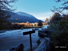 … allerdings muss das „wärmere Argentinien“ noch etwas auf uns warten. Das wird uns bewusst, als wir unser Lieblingsplätzchen am „Camino de los siete Lagos“ ansteuern. Zwar sind wir für diese Nacht schon 130 km in nördliche Richtung gefahren, aber von „mehr Wärme“ ist noch keine Spur. Ganz im Gegenteil. Als wir am nächsten Morgen aufwachen ist die Welt um uns in romantischer Art tiefgefroren. Die Bilder sprechen für sich…
