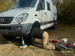Luftlinie noch keine 250 km von Bariloche entfernt, ereilt uns das nächste Problem mit unserem Indi. Wir befinden uns gerade im Parque Nacional Laguna Blanca, als es anfängt im Auto fürchterlich nach Diesel zu stinken. Es ist nicht das erste Mal, dass uns das passiert. Deshalb stoppen wir sofort das Fahrzeug um unter der Motorhaube zu kontrollieren was kaputt ist: Der Wasser-Ablass-Schlauch unseres Diesel-Filters ist abgesprungen und nun sprudelt der Kraftstoff bei laufendem Motor nur so heraus. Eine schreckliche Sauerei und schlimm für die Umwelt! Mit einer Klemmschelle ist der Schlauch schnell provisorisch fixiert und wir können ohne Probleme in der nächsten Stadt die Werkstatt aufsuchen. Das Team der Werkstatt „Taller Ciudad de Zapala de Horacio San Martín“ ist sehr freundlich und hilfsbereit. Auch deshalb, weil man hier in Argentinien nur selten einem 6-zylindrigen 4x4-Sprinter unter die Haube blicken kann. Bereits eine Stunde später können wir mit einem neu befestigten Diesel-Schlauch die Werkstatt wieder verlassen und unsere Reise Richtung Norden fortsetzen.