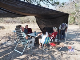Unser zweiter Standort im Alto Paraguay ist am Hito IV direkt an der Grenze zu Bolivien. An dieser Stelle liegt eine der wenigen Wasserstellen, die noch etwas Wasser führen. Genauer gesagt ist es eigentlich nur noch ein Drecktümpel, aber immer noch genug feucht um wilde Tiere vor dem Verdursten zu retten. Hier haben wir gute Chancen Tiere zu beobachten. Während wir am Wasserloch sitzen entdecken wir ganze Vogelschwärme, die sich wild in das Nass stürzen. Ein Reh kommt vorbei und zwei Mal auch eine Herde von 20-30 Wildschweinen, auf die wir so sehr gewartet haben. Oswald erklärt uns, das sind Halsband-Pekari. Eine Wildschwein-Art die in tropischen Regenwäldern und in Trockenbuschgebieten Mittel- und Südamerikas leben. Wildkatzen sehen wir leider keine. Nur Spuren zeugen von der Anwesenheit dieser grazilen Vierbeiner.