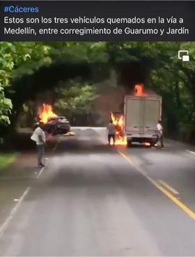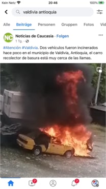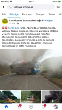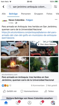 Am nächsten Morgen fahren wir auf der unbefestigten Strasse weiter entlang steiler Hänge und leider mit wenig Aussicht, da die bewaldeten Berge nebelverhangen sind. Im nächsten Dorf endet unsere Fahrt vor einer Strassenbaustelle. Wir müssen umdrehen und fragen, ob es eine Alternativroute gibt. Die Frauen sehen uns erschrocken an. Was??? Ihr wollt über San Jerónimo nach Santa Fe de Antioquia? Ausgeschlossen! Die Einheimische wirkt panisch. Habt Ihr nicht von dem paro armado gehört? In San Jerónimo wurde und wird auf Menschen geschossen, die sich den Anordnungen der Otoniel-Anhänger widersetzen. Ihr müsst sofort stehen bleiben und wenn Euch euer Leben lieb ist versteckt Ihr Euch im Auto. Wir fassen es nicht. Wir sind gestern doch erfolgreich aus der Roten Zone geflüchtet. Aber dem ist nicht so. Wie wir in den Kolumbianischen Nachrichten lesen und den Sozialen Medien entnehmen können, ist das Gebiet des „Clan del Golfo“ riesengross und wir stecken immer noch im südlichen Randgebiet. Hatten wir nun Glück, dass wir auf unserem Weg aufgrund einer Strassenbaustelle nochmal umdrehen mussten und in San Jerónimo nicht direkt in einen Schusswechsel geraten sind…? Das Städtchen San Pedro de los Milagros, das wir gestern passiert haben, wurde inzwischen sogar mit brennenden Fahrzeugen versperrt. Wir können also weder vorwärts, noch zurück. Es bleibt uns nichts anderes übrig als hier stehen zu bleiben und zu hoffen, dass keiner eine Brandbombe in unser Auto wirft.